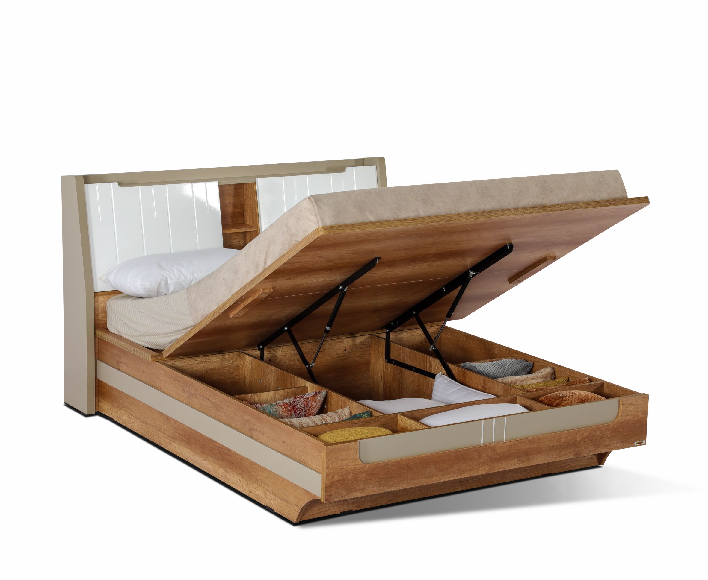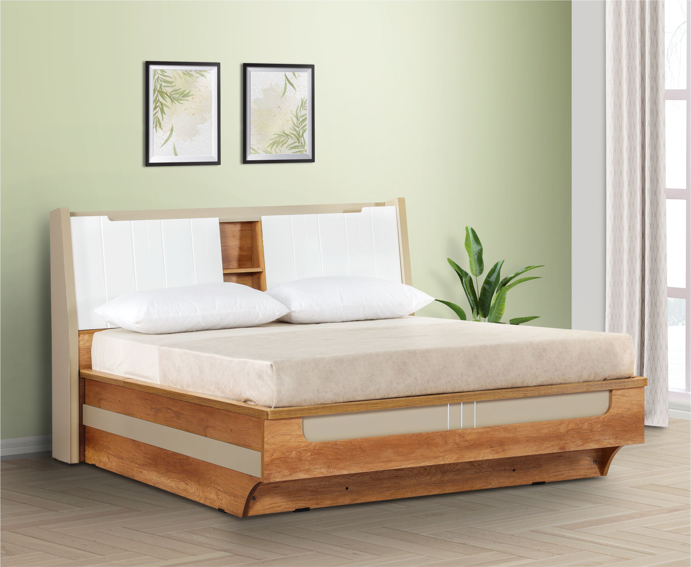 Felcity Hydraulic bed with Hybrid Storage, a perfect blend of functionality and style. This luxurious bed is designed to provide you with ample storage space while ensuring utmost comfort. The headboard area features convenient storage compartments, allowing you to easily access your essentials such as books, electronics, or personal belongings. With this cleverly integrated storage solution, you can keep your bedroom organized and clutter-free.