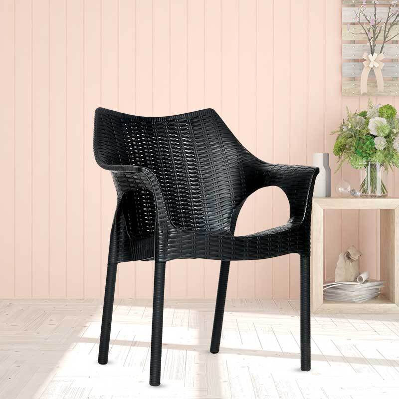 A unique contemporary design of upscale class rattan look chair with angular & ergonomical back design for long hours of comfort seating. Coming in a pleasing range of shades.