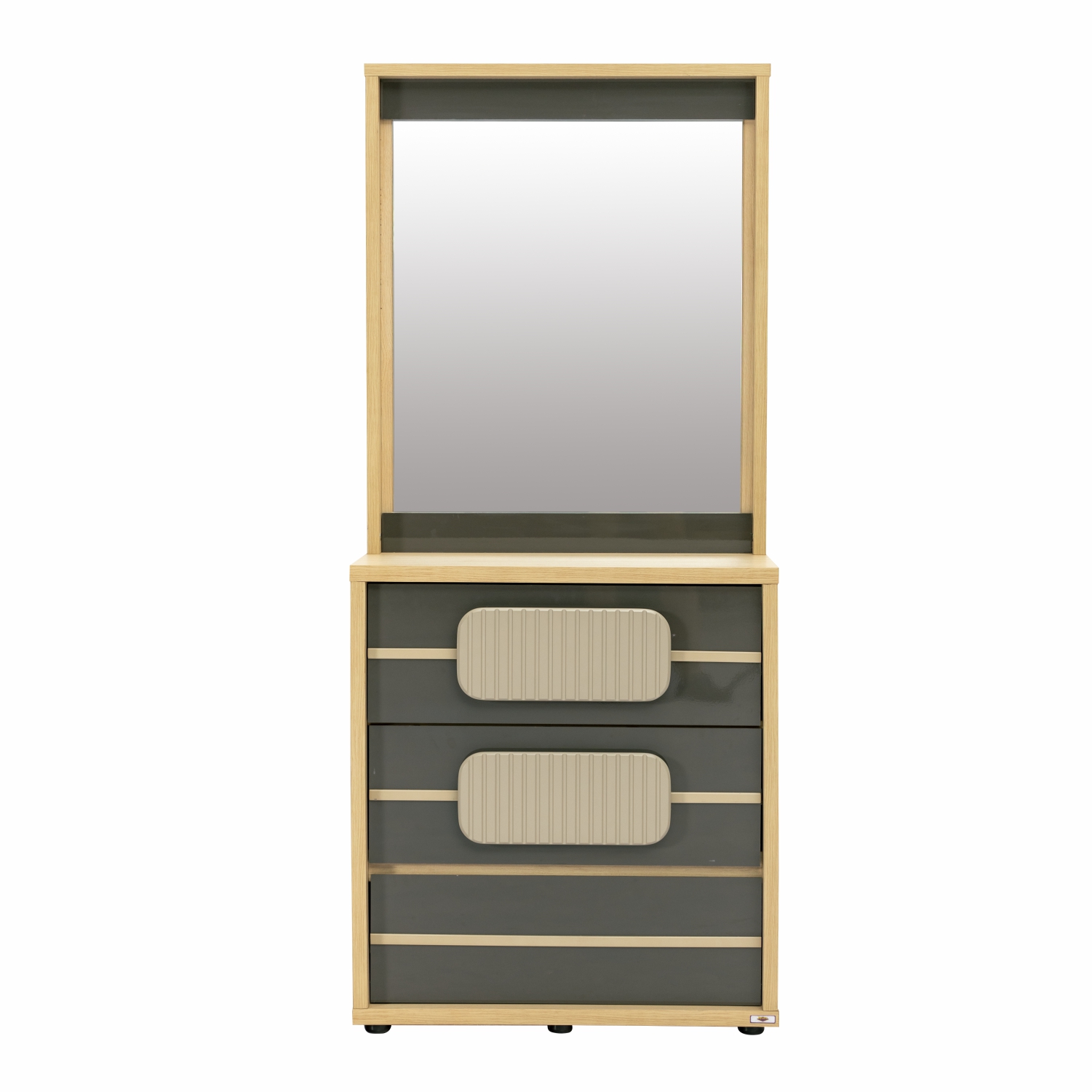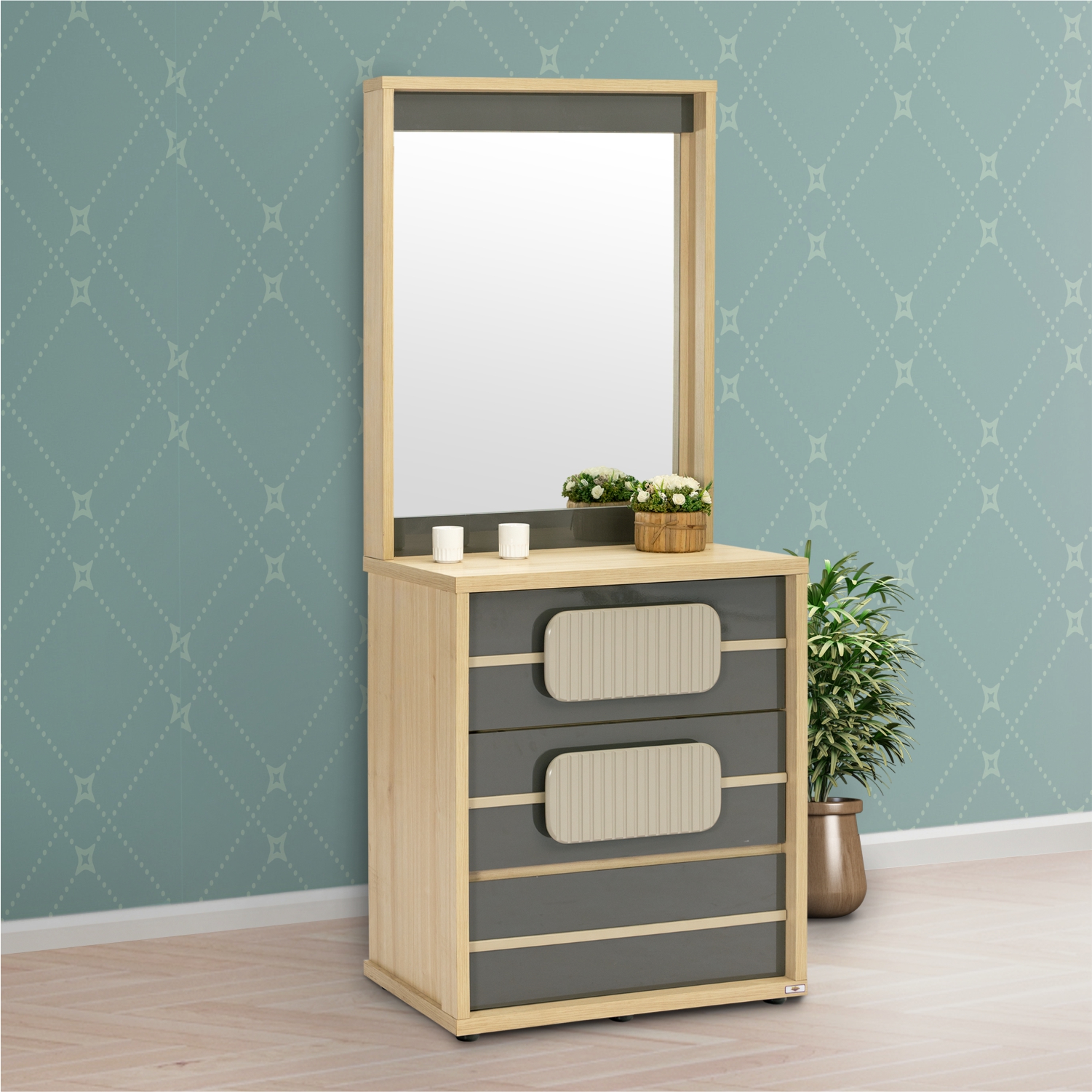 The Athena Dressing Table is a stylish addition to any bedroom, crafted from melamine faced engineered wood for durability. it features three spacious drawers with a high gloss finish. The dresser boasts an attractive design enhanced by decorative add-ons and fluted MDF handles for the hinged door. With no sharp corners and stylish fluted handles, it provides a safe and visually appealing addition to your room.