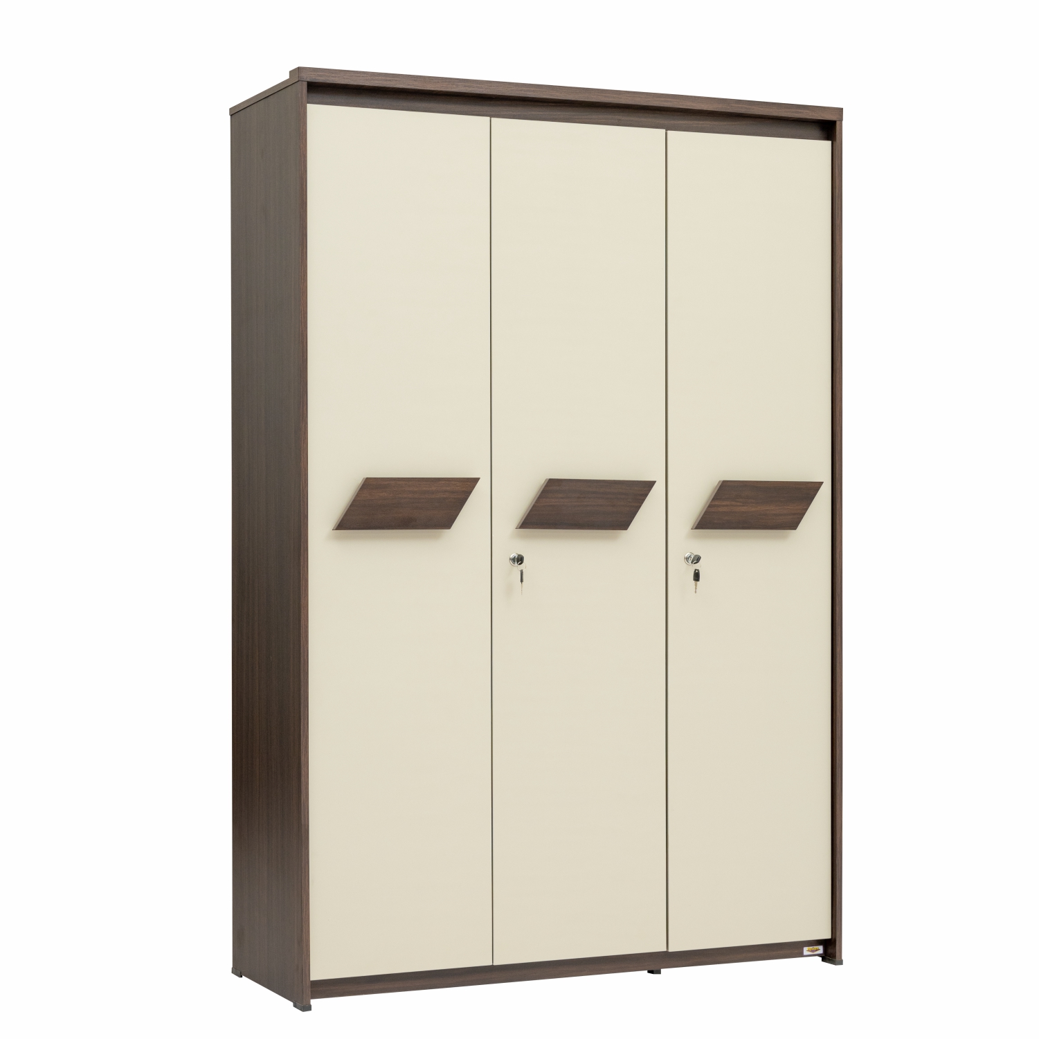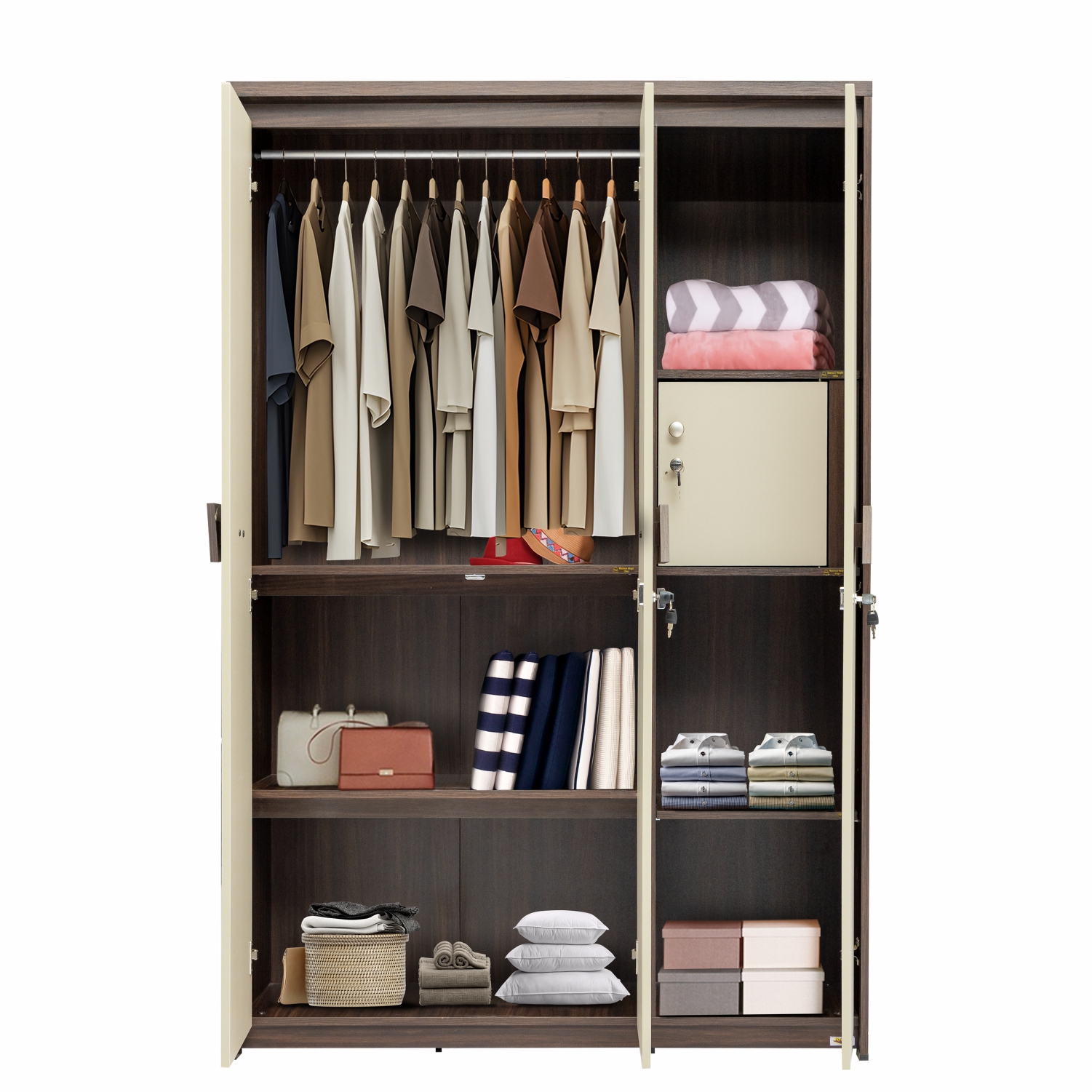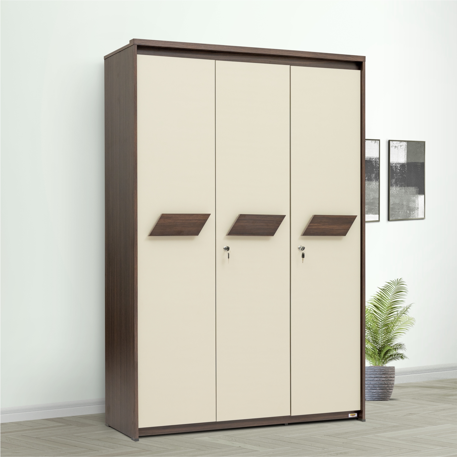 This Georgia 3-Door Wardrobe is made of engineered wood, It features a practical design with space for hanging clothes, a secure locker box for valuables, and a wide shelf at the bottom for extra storage. With its unique two-tone design this wardrobe provides ample space for organizing your belongings efficiently, making it a reliable and functional addition to any room.